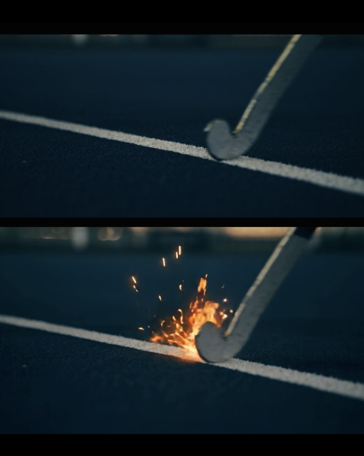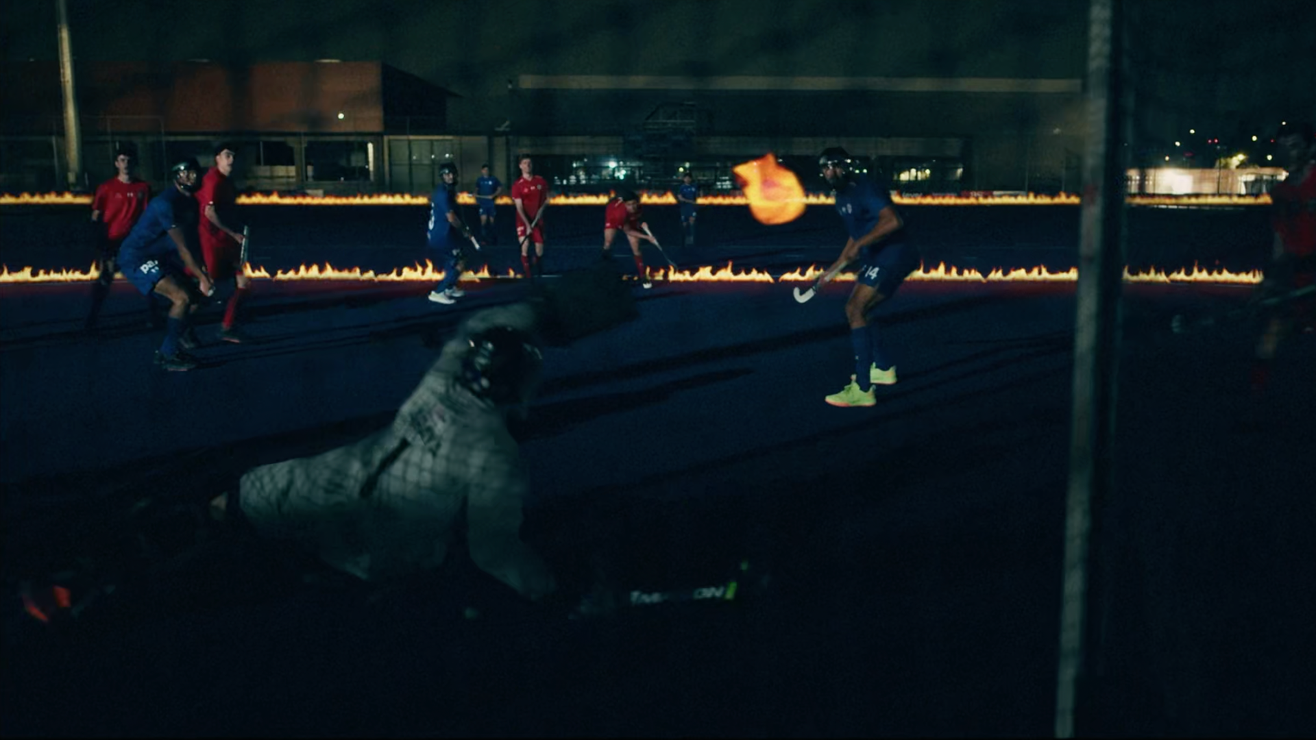 The shoot itself was technically demanding. We started in the changing room for product placement, then moved to the field for action sequences. We're not hockey players, so we figured out what would be exciting – a tackle, a play going through defenders, scoring a goal. We built that classic tension and resolution. The players were pros, so they executed it perfectly.
